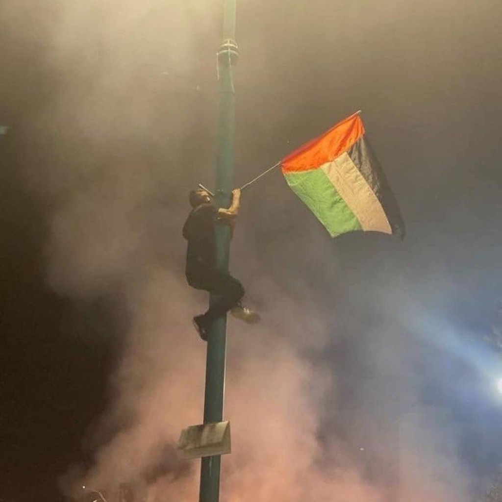 في شهر أيار ٢٠٢١، راجت صورةٌ على موقع تويتر لشابٍ يتسلق عمودَ إنارة وسط مظاهرة حاشدة، مرتقيًا فوق الدخان وحاملًا العلم الفلسطيني بيده، بينما مصابيح الشارع تشعُّ عبر سحب الدخان فتُضفي مسحةً سينمائية على المشهد. ولأن الصورة التُقطت وهو يتحرك، شابتها الضبابية بعض الشيء. الشاب في ثياب سوداء، والألوان الزاهية الوحيدة في الصورة هي ألوان العلم الأحمر والأخضر والأبيض. الصورة لشاب من اللِّد، مدينة فلسطينية في الداخل المحتل، وهذه كانت صرخته للحرية.