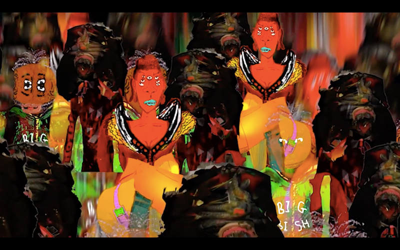 Makumbe’s work exists on three adjacent screens, one of which is connected to headphones for audiences who choose to engage more deeply with the work. I ask them how the three screens, each part of the tryptic, are connected.