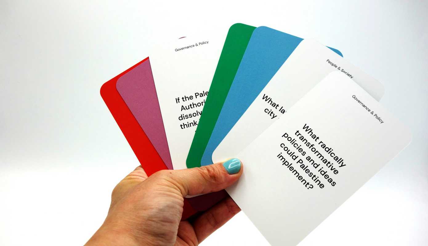 CPF comprises more than 70 different questions, grouped under six unequally weighted themes, with each printed on an individual card. Some are framed as immediate and urgent, while others take a medium- or long-term perspective on what a Palestinian future might entail. The questions range from “What would be done with the apartheid wall?” to “What would the impact to surrounding Arab countries be if the majority of their Palestinian [refugee] populations left?”