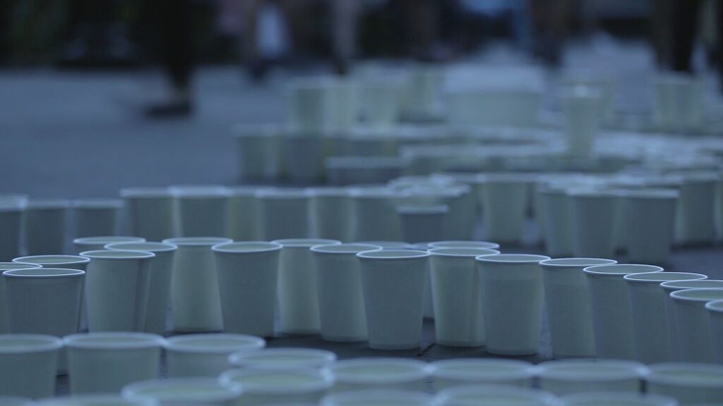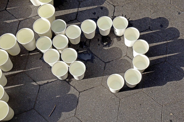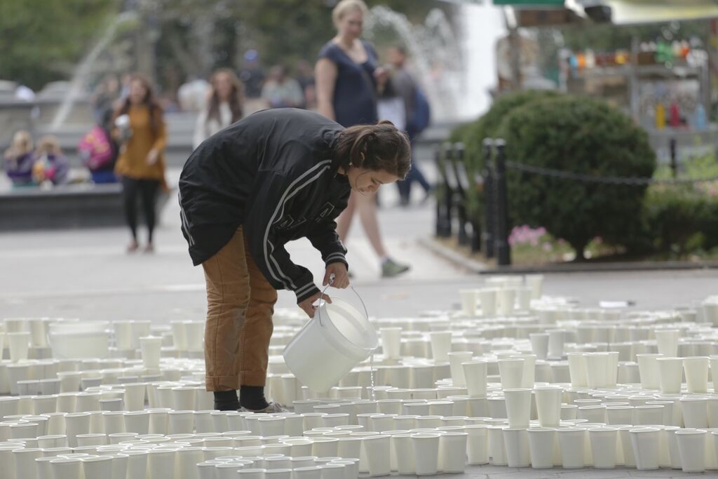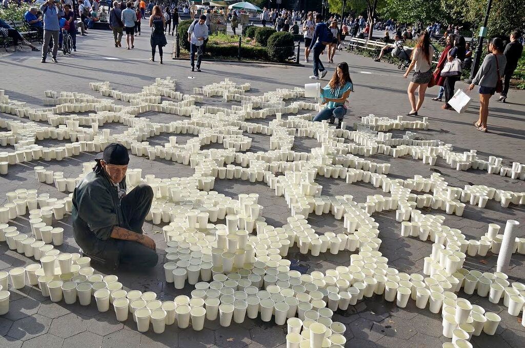 A week before the installation, I am a nervous wreck. I’ve gotten into many heated arguments about “memorializing terrorists” in New York City. I am worried about the safety of myself and of the friends who have agreed to help build the piece. Washington Square Park is haunting me. I sit in there for hours watching traffic patterns, the random waves of people that pass through the plaza. I watch New Yorkers for signs, trying to see if the war is in them. I start to worry it is. Maybe all this calm, this bourgeois relaxation is just an illusion. What will happen if I disrupt it? Will all hell break loose? And if it does, is that what I want? Every day I am trying to research. The more I research, the less I understand. I don’t know if I am contributing to these lost lives at all. I have never met these people, nor will I ever meet them. I have no Somali or Yemeni friends. I have not helped with any anti-war or anti-drone petitions. I remind myself this is not a research paper, it is an art installation; I do not have to cite my sources. I am speaking as who I am: a white passing Mexican girl from California, who has never experienced war, but is overcome by a need to act. That’s all I can claim. It may not be good, but it is honest. The night before the installation I work on my artist’s statement. I have slept a total of six hours in the past two days. Around 10:30 it is done. I fall, heavy and nervous, into sleep. In the morning I rise and make coffee. My hands shake. Our filmmaker Charlie and my good friend Shireen arrive around 5:30. We struggle to strap ladders onto the roof, to fit 2,500 cups into the car. The sun is rising. We set off, the Williamsburg Bridge becoming bathed in light. We unload and begin. For the first few hours most people ignore us. Some read our signs then continue on with no expression. There are only a couple of hundred cups out at this point; I think this is why no one cares. A journalist for Al-Arabiya passes on her morning jog and takes an interest. I am thrilled that anyone stops at all. One man talks with me at great length, thanking me for creating the piece. At around 8:30 am, we receive our first critic, a man who draws hearts and claims to be the most famous artist in the world. “That’s cool,” I say. “No,” he says, “cool is a temperature.” He tells me we are focusing too much on negativity and that negativity breeds more negativity, and this is why his art is so much better than mine. He says we must “ignore negativity”. I try and point out that you cannot “ignore negativity” when you’re the target of a drone strike. “How old are you anyways?” he asks. “Twenty-two,” I reply. “Ah,” he says, “you can’t see it now but when you’re older you will. Your art is good, but if you want to be truly great, you have to ignore the bad shit, like me.” At that moment a large gust of wind blows a stack of my artist’s statements around the plaza. “That was an act of god!” he shouts. Before he leaves, he draws two hearts on the ground with chalk. As the exhibit grows cups are placed over them. Water spills and the heart’s borders warp eventually becoming unrecognizable. The labor of filling up the cups is surprisingly meditative. My friends and I chatter and joke as we work. I haven’t seen many of them in months, the sun is shining, and we are becoming a young community of artists. We have purpose, and momentum. We are happy. Still, in the back of my mind, it strikes me as strange, the joy emanating from us. We are representing people murdered by our government. We are laughing and enjoying ourselves. I know imposing a fake solemnity would be absurd and offensive, so instead I focus on being honest. This is what is happening now. A hang. Around 9:30 am, the first stranger joins our group: a young boy named Miguel, a junior in high school. He was sitting by the statue watching and reading a book for an hour, then eventually came over and asked what we were doing. Later I look up to see him fetching water from the fountain. I thank him for his help and he stays a few hours. When I have a free moment I talk to him, we joke about how he’s supposed to be in class. He tells me it’s a free period. I don’t know if he is lying or not, but I don’t care. The exhibit is growing now. It’s 11am and we still haven’t finished the first thousand. The interest is growing too. Barely two minutes pass without someone wanting to speak with me. A drunk veteran who fought in Iraq talks with us for half an hour. His beer is leaking ever so slightly through the brown paper bag it’s hidden in, creating a dark stain. I watch it grow. “Lieutenants, they don’t even know what’s happening, and the shit just trickles down,” he says. “And there are private contractors — everyone thinks it’s Haliburton, it’s not just Haliburton. It’s more than that, I don’t even know who. No one does… I’m saying too much but oh well.” Part of becoming part of the park is talking to people you would normally avoid. The intention of this piece is to start a conversation, and we have an obligation to listen to everyone. An old white Irish man approaches us and starts yelling about dirty Muslims. I was expecting this. He doesn’t understand why we aren’t making art about the Christians killed by Muslims. We tell him this isn’t the purpose of the piece. He and the veteran get into an argument about something in military speak regarding rank — I don’t understand. He storms off, red in the face. By 11am we have a crowd around us that will stay until 8pm. The flow of people comes and goes in waves. We find ourselves constantly surrounded by strangers. On a trip to the fountain Charlie says to me excitedly, “This is like a real art piece in New York City! People are actually paying attention!” “I know,” I say. I can hardly believe it myself. Every other minute someone stops me from whatever I am doing to “
