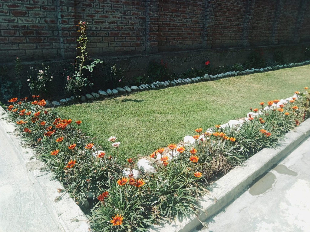 Then, there’s her flower garden. In the middle, there’s a rectangular grass plot with raised soil beds for flowers on all ends. On the upper and left bed, apart from different flowers, there are trees of almond, pear and cherry.