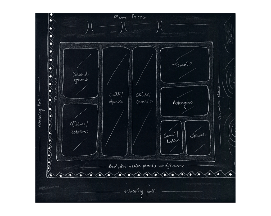 I drew this sketch of her kitchen garden, in which vertical strip-like patches are for rohun (garlic) and marchiwangan (chilli). The small square plots are for vegetables, such as haakh (collard greens), muji (radish), wangan (aubergine), aalivi (potato), andruwangan (tomato). On the right, left and lower sides, separate beds are dug out for flowers, cucumber and maize plants. The borders are marked with painted bricks forming a uniform pattern. On the upper brick-walled side, there are three plum trees.