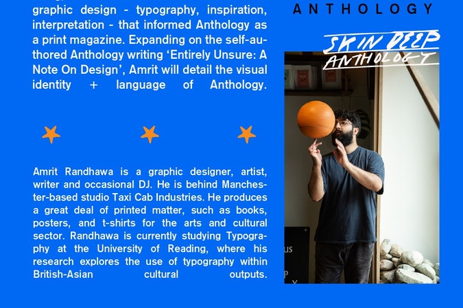 Join us for an afternoon online with artist Amrit Randhawa, who led the visual and creative direction of Anthology. In conversation with Skin Deep’s Co-Creative Director Sylvia Hong, Amrit will share an overview of graphic design – typography, inspiration, interpretation – that informed Anthology as a print magazine. Expanding on the self-authored Anthology writing ‘Entirely Unsure: A Note On Design’, Amrit will detail the visual identity + language of Anthology.